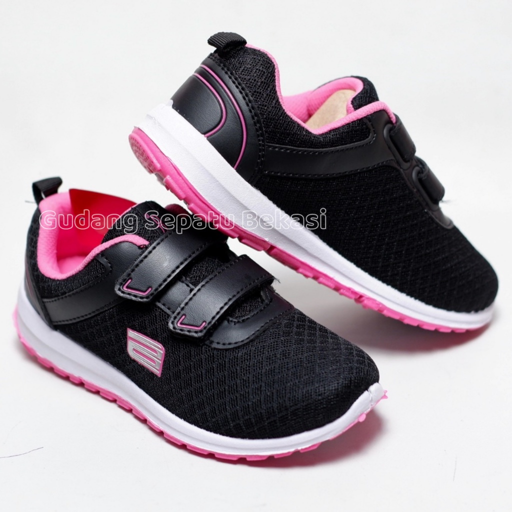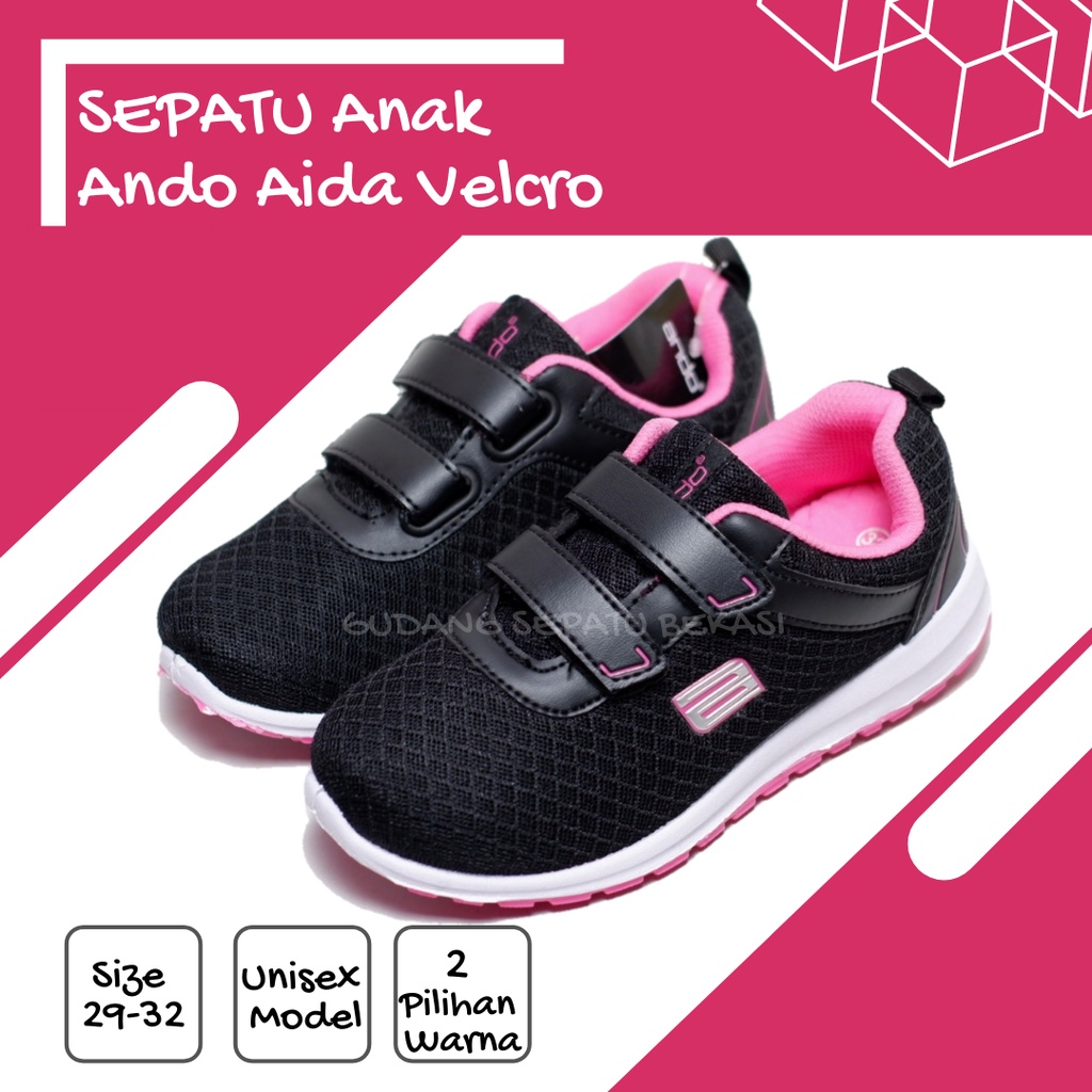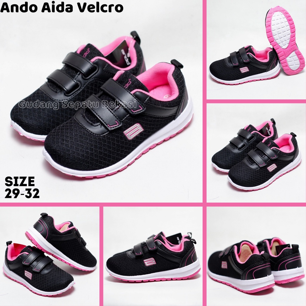 Harga Sepatu Anak Sekolah Perempuan Paud TK Kelas 1 SD Anak-anak Cewek Kecil Ando Perekat Velcro Hitam Full Pink Spatu Sneakers Skolah Usia 4 5 6 7 Tahun Size 29 30 31 32 -Aida Velcro-